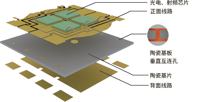 薄膜電路陶瓷封裝基板是一種通過磁控濺射薄膜金屬化與電鍍制程的技術:即根據應用需要,在高導熱的陶瓷基體上,采用薄膜金屬化及影像轉移方式制作2D金屬線路,然后采用TCV(Through Ceramic Via) 技術形成雙面布線間的垂直互連,最后采用堆疊技術獲得與陶瓷基體結合緊密的一體式3D金屬框架?;诒∧る娐饭に嚕ㄟ^磁控濺射實現陶瓷表面金屬化,通過電鍍實現銅層和金成的厚度大于10微米以上即DPC(DirectPlateCopper-直接鍍銅基板)。